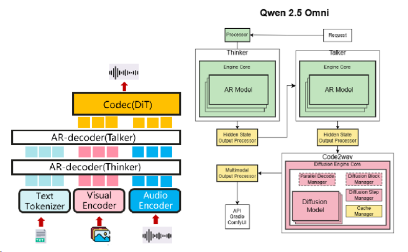 - LLM 核心(LLM Core):基于 vLLM 的自回归文本 / 隐藏状态生成部分,可以是一个或多个语言模型,用于思考、规划和多轮对话。