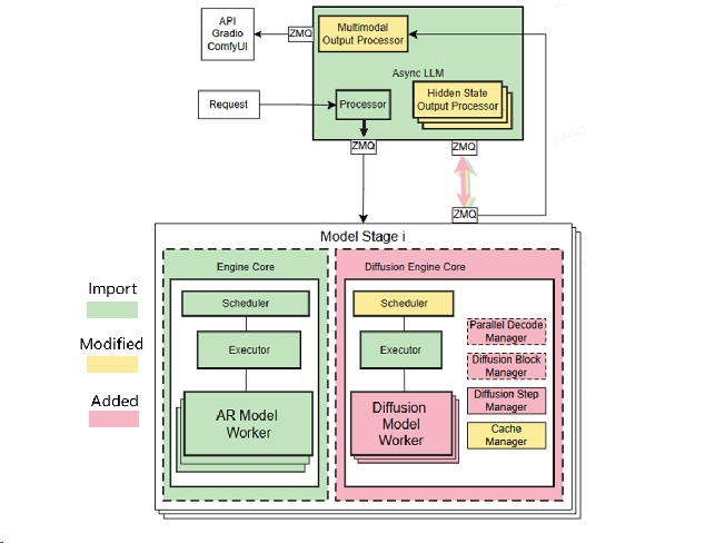 Vllm-omni将从现有的vLLM框架中导入核心模块(LLM),并引入几个新的组件(DiT)和修改(调度器)以实现其目标。核心架构将基于模块化设计,允许独立开发和集成不同的模态处理程序和输出生成器。