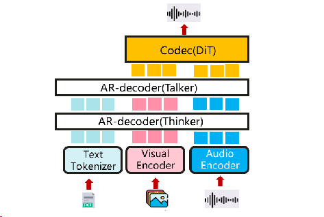 多模态输入输出的新模型。它设计了thinker-talker-codec结构,该结构是双AR+DiT格式。(例如qwen-omni)