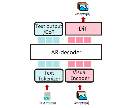 一个统一的多模态理解和生成模型。视觉生成可以利用CoT文本生成输出。主要的统一多模态模型与结构相似。 (例如BAGEL)